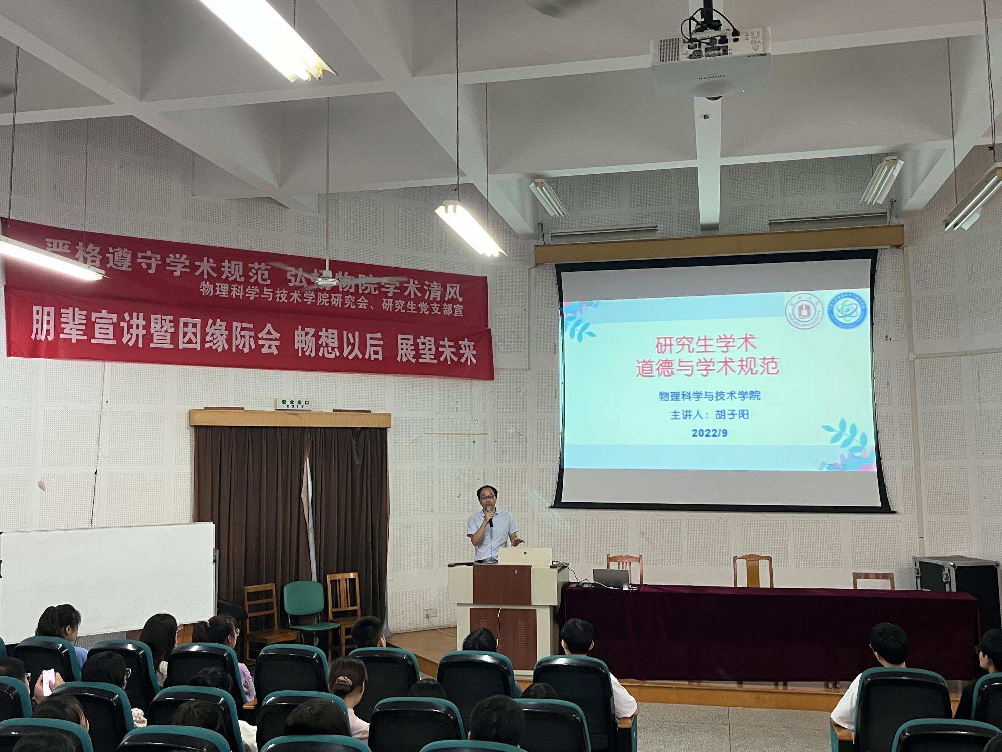 为进一步加强物院研究生学术道德建设,遵守科学道德和学术诚信,杜绝学术不端行为,营造良好的学术氛围和制度环境。9月23日,物理学院在龙赛报告厅举行“严格遵守学术规范、弘扬物院学术清风”为主题的讲座活动。本次活动特别邀请了党委委员胡子阳教授进行讲座,22级硕士新生参加此次活动。