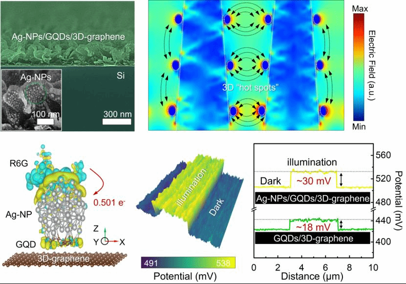 该研究工作从材料获取、结构设计与制造、器件性能调控和物理机制等方面开展系统的研究,提出一种新颖的三维Ag-NPs/GQDs/3D-graphene/Si杂化结构用于生物传感器,基于该杂化结构中3D-graphene自身具有天然等离子激元纳米谐振腔和Ag-NPs形成三维“Hot Spots”,使其具有高灵敏和低浓度的检测极限。通过实验验证理论,理论(时域有限差分和第一性原理)指导传感器基底的构建,揭示了等离子激元和三维“Hot Spots”对光吸收增强的内在机制,并阐明了该杂化结构中静态/动态的电荷移动动力学过程。该研究工作将为新型生物传感器的结构设计和多模式生物探测提供重要的科学参考价值。