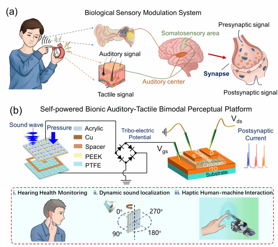 摩擦纳米发电机(TENG)可以将环境机械能转化为电信号,具备自供电能力。课题组在前期研究中通过选取特定的材料和结构,摩擦纳米发电机可感知各种声波信号,在此基础上构建了具有自主信号处理能力的听觉感知系统,实现了对声波信息的加密与解密功能。由于声频敏感摩擦纳米发电机(SFS-TENG)的声波频率敏感特性,器件对不同速率的声源具有不同的响应,从而实现了对多普勒效应的演示,并展示了其在智能交通中的应用前景。相关工作发表于Nano Research 2025, 18, 94907378 (第一作者周思远,通讯作者竺立强)。在本研究中,课题组进一步提出了供电仿生听觉-触觉双模态感知平台(SBAT-BPP),集成了摩擦纳米发电机(TENG)和壳聚糖栅控的氧化物神经形态晶体管,能够高效感知听觉和触觉双模态信号。TENG具备复杂的跨模态神经形态实时感知能力,可将声音和压力信号转换为电信号,其对声音信号表现出60-10000 Hz的宽检测范围和~1.65 V/dB的高灵敏度,而对压力信号具有63 mV/N灵敏度,相比传统单模态传感器更具优势,为多感官智能感知提供了关键技术支持。将TENG的传感和能量收集功能与ITO神经形态晶体管的记忆和学习功能相结合,可在感知平台中实现低功耗智能传感。此外,得益于SBAT-BPP系统出色的距离传感和方位角传感能力,基于声压传播定律构建了距离-电流模型,通过样条插值法得到的方向性函数构建了方位角-电流模型,基于此进一步集成构建了声源定位统一模型并融合运动正则化约束算法,实现了动态声源的高鲁棒定位。SBAT-BPP凭借其自供电特性、简单架构和多模态感知能力,在听力健康监测、动态声源轨迹识别和触觉人机交互等领域展现出了广阔的应用前景。该策略通过单一感知系统实现了听觉和触觉的双重感知,为人机交互和便携式人工智能系统的发展提供了借鉴。