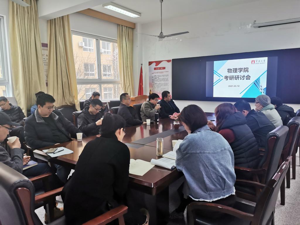 3.12日上午,物理学院在116召开2021届考研工作研讨会,会议由教学副院长楼慈波老师主持,党委副书记刘小娣老师、各系负责人和各班班主任参加了此次会议。首先,楼老师介绍了2021届毕业生的考研报考情况和目前考研初试成绩的情况,今年的情况比较严峻,本科报考率和初试成绩都不高,和2020届相比出现了大幅度下滑。接着,各班主任从实际情况出发,分别介绍了各班级各专业的具体考研和准备情况,与会老师积极讨论,从学生准备和考...